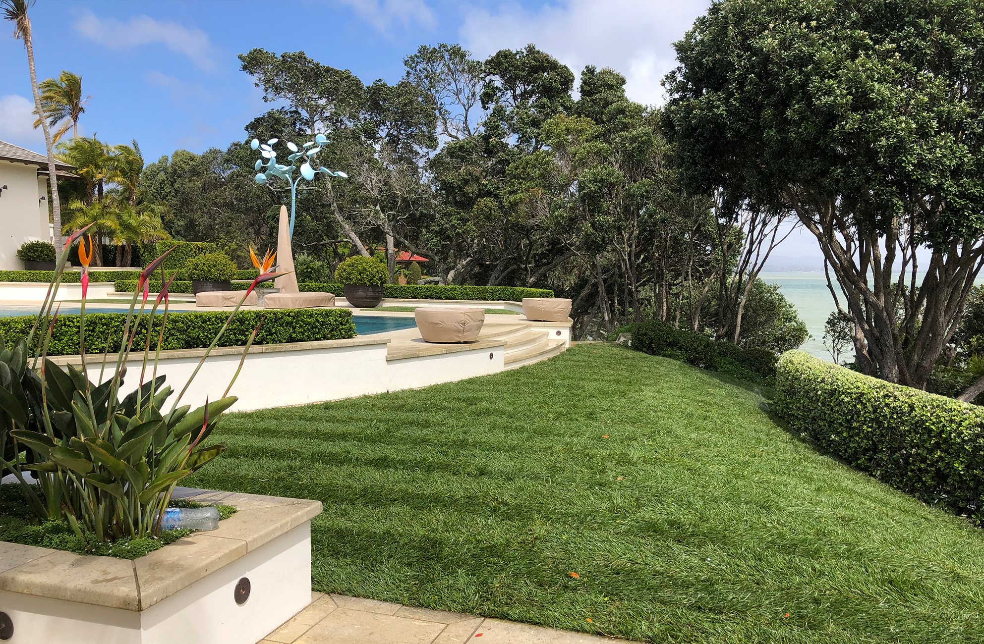 This expansive clifftop property required a lawn to display sculpture art, so we infilled the former driveway space and completed the property with a turf installation that perfectly complemented the manicured gardens.